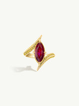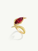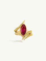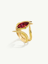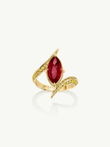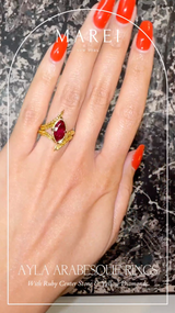 The Ayla Arabesque Engagement Ring by Angie Marei is a timeless piece that is sure to enchant with its captivating ultra-feminine design that exudes sophistication. This unique piece features a brilliant-cut marquise ruby center stone embellished with pave-set glittering vivid yellow diamonds and crafted from 18-karat yellow gold. A perfect symbol of your eternal love.