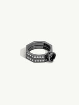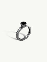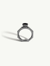 Signify your love with our Octavian Lotus Diamond Engagement Ring by Egyptian-Dominican jewelry designer Angie Marei featuring an enchanting black diamond mounted on a blackened 18-karat gold setting carved with elegant details of an Ancient Egyptian lotus flower accented with sparkling white diamonds.