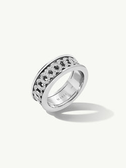 The Amanti Spinning Infinity Ring by New York jewelry designer Angie Marei is exquisitely handcrafted with great precision in luxurious 18-karat white gold precious metal. This elegant design possesses an intricate pattern of brilliant pavé diamond geometric dimensional windows creating a glittering vignette that shines and reflects light from all angles.