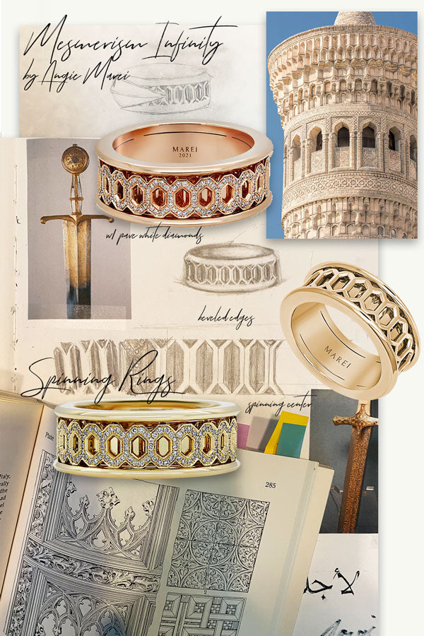Inspired by Tibetan meditation spinning prayer wheels and the designs of ancient Arabesque and Islamic decorative arts, Marei designed this timeless collection with a unique architectural structure that makes an impression of unending repetition that symbolizes infinite life. In Islamic art, the figure of the circle represents unity and the ultimate source of all diversity in creation. This use of sacred geometry is believed to reflect the language of the Universal Higher Power by reminding us to reflect on the greatness of our divine creation.