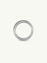 The Ignis Diamond Edge Accented Band by Angie Marei features an extra-wide 8mm band handcrafted in 18-karat white gold and two rows pavé set brilliant-cut white diamonds along the top and bottom edges of the band. The gorgeous sparkling white diamonds create an eye-catching scintillating effect of flashing spectral-colored sparkles.
