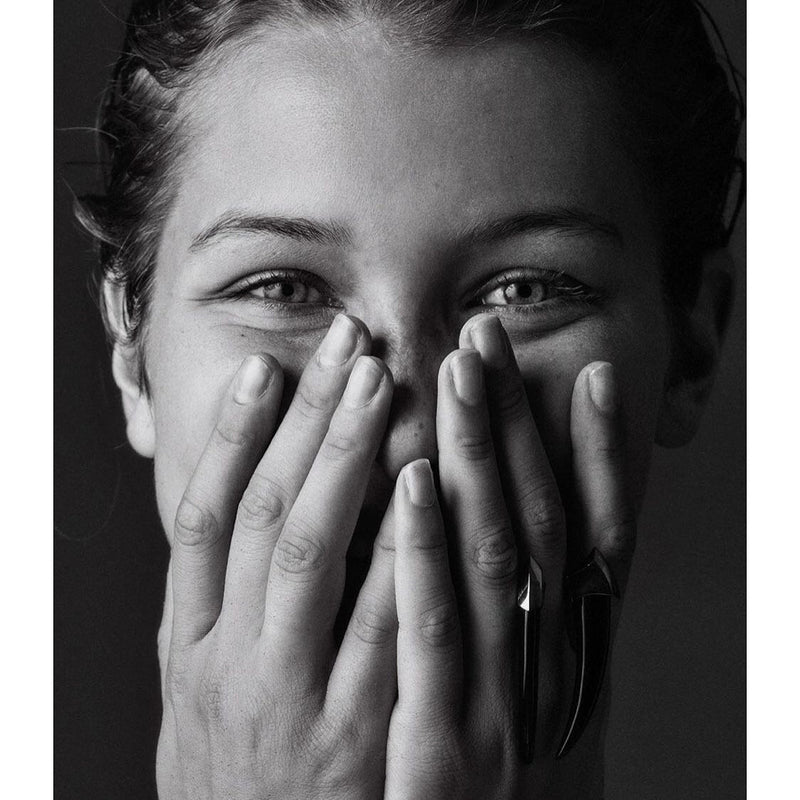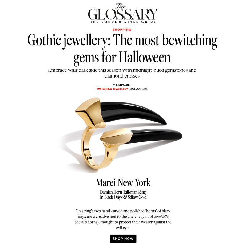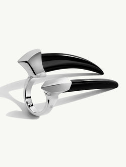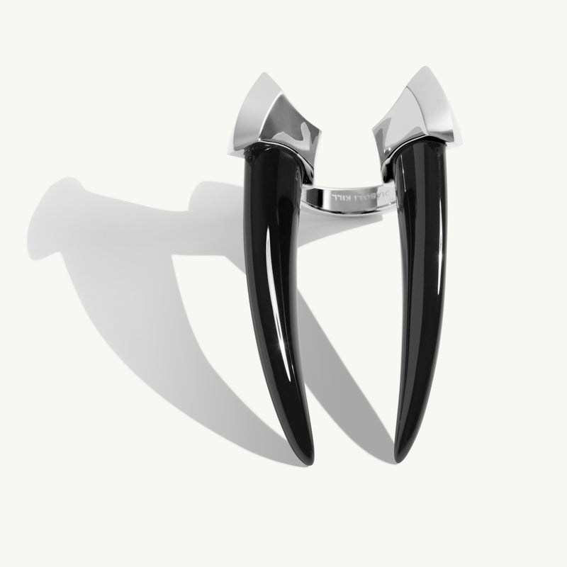 The Damian Black Onyx Horn Talisman Ring by Angie Marei features two hand-carved and polished black onyx horns mounted in a luxurious solid 18-karat white gold setting. With its salient features, the smooth onyx stones and gleaming gold create an evocative and unique silhouette taking inspiration from apotropaic talismans worn by the royal Ancient Egyptians. This monumental jewel is meant to be worn and proudly displayed with an air of confidence that will surely captivate and subdue your audience.