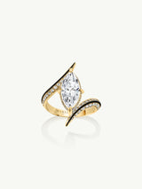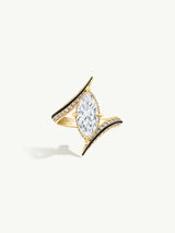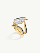 The Ayla Arabesque Engagement Ring by Angie Marei is a timeless piece that is sure to enchant with its captivating ultra-feminine design that exudes sophistication. This unique piece features a brilliant-cut marquise white diamond center stone embellished with pave-set glittering white diamonds crafted from 18-karat yellow gold and detailed with black enamel. A perfect symbol of your eternal love.