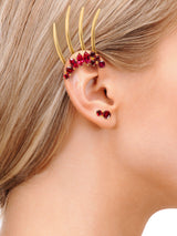 The Isadora Two-Stone Stud Earrings by Angie Marei feature gorgeous brilliant-cut red garnets in luxurious 18-karat yellow gold claw settings. These earrings are named after the ancient Egyptian goddess Isis, who was known for her strength, beauty, and wisdom.