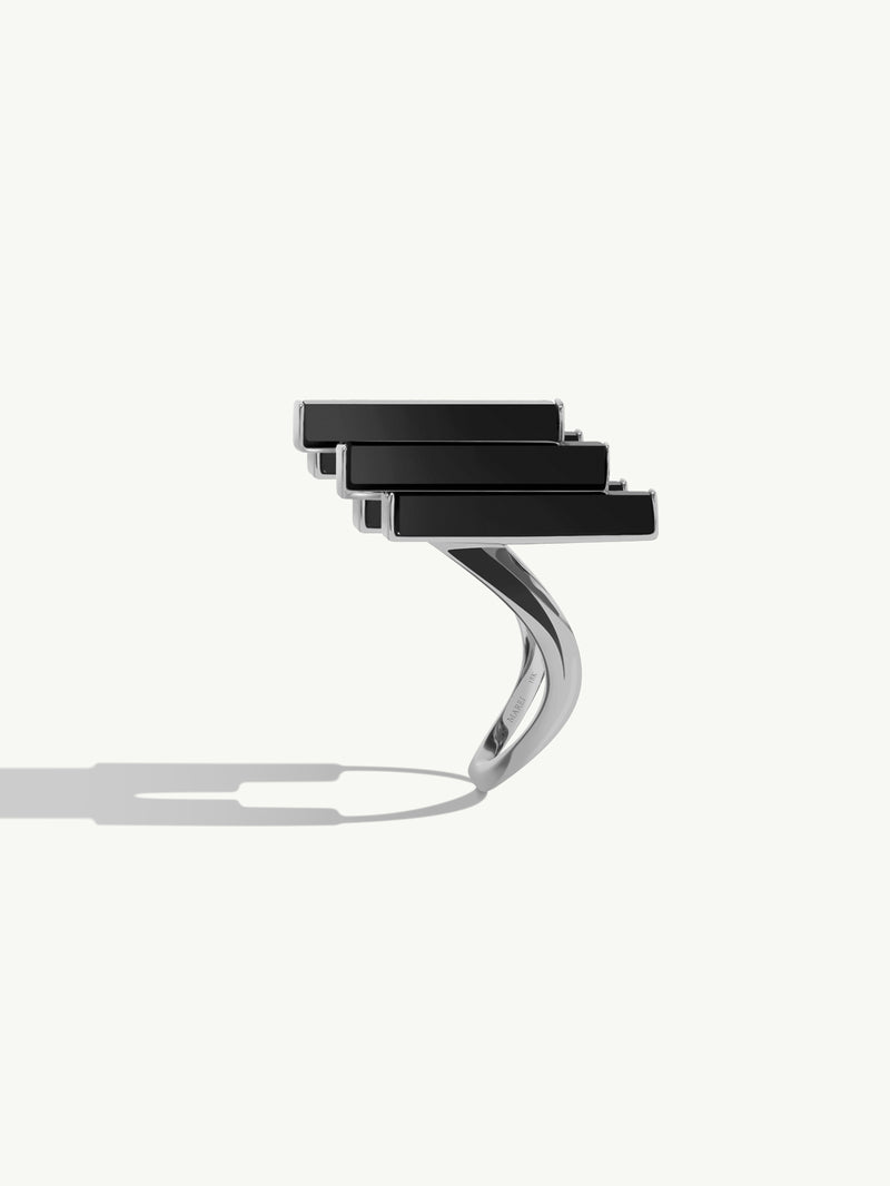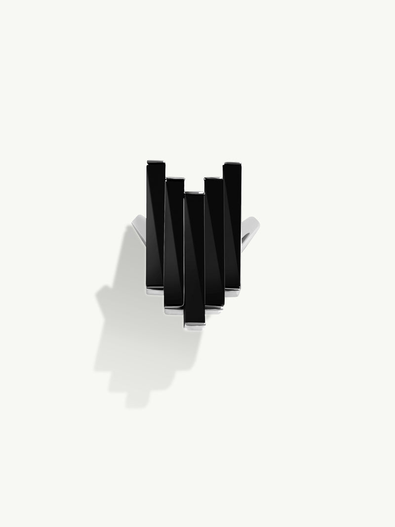 The Invidia Black Onyx Column Ring by New York jewelry designer Angie Marei. Exquisitely hand-crafted in 18-karat white gold and polished black onyx gemstones. This beautiful architectural ring combines the opulence and glamour of the Art Deco era with the marvelous jewels of the Ancient Egyptian royals.