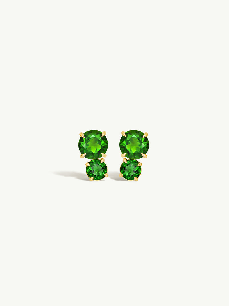 The Isadora Two-Stone Stud Earrings by Angie Marei feature gorgeous brilliant-cut green Tsavorite garnets and Tourmaline in luxurious 18-karat yellow gold claw settings. These earrings are named after the ancient Egyptian goddess Isis, who was known for her strength, beauty, and wisdom.