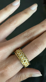 The Amanti Spinning Infinity Ring by New York jewelry designer Angie Marei is exquisitely handcrafted with great precision in luxurious 18-karat white gold precious metal. This elegant design possesses an intricate pattern of brilliant pavé diamond geometric dimensional windows creating a glittering vignette that shines and reflects light from all angles.