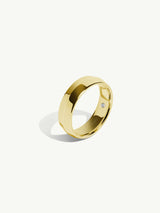 The bold and 6mm Eterno Knife Edge Wedding Ring by Angie Marei is handcrafted in solid 18-karat yellow gold and finished in a high shine polish. A sparkling single white diamond is secretly set inside the band, touching the skin, offering a romantic element of surprise and a symbol of love. This ring is perfectly designed to provide a classic and refined masculine look with a comfortable fit.