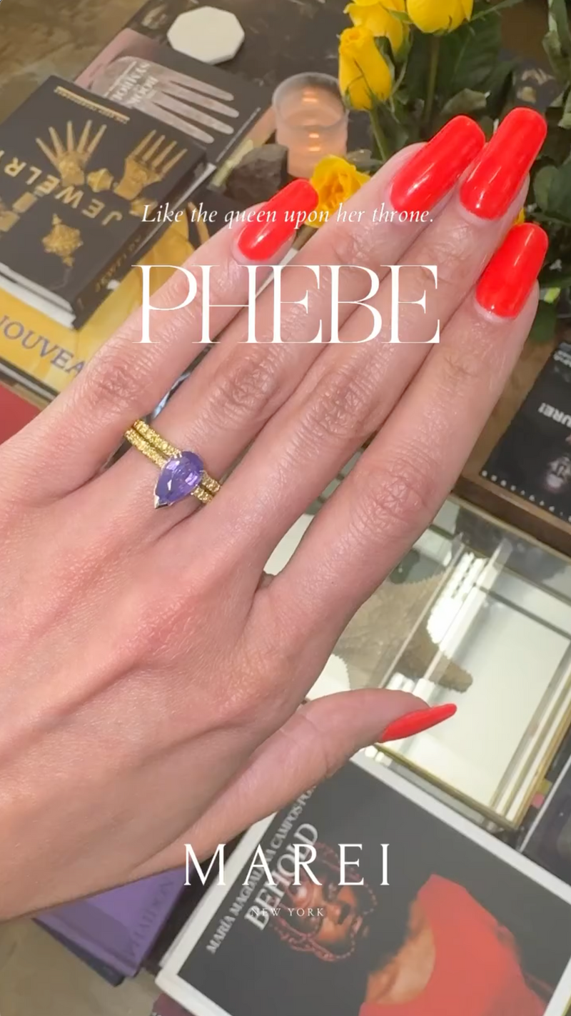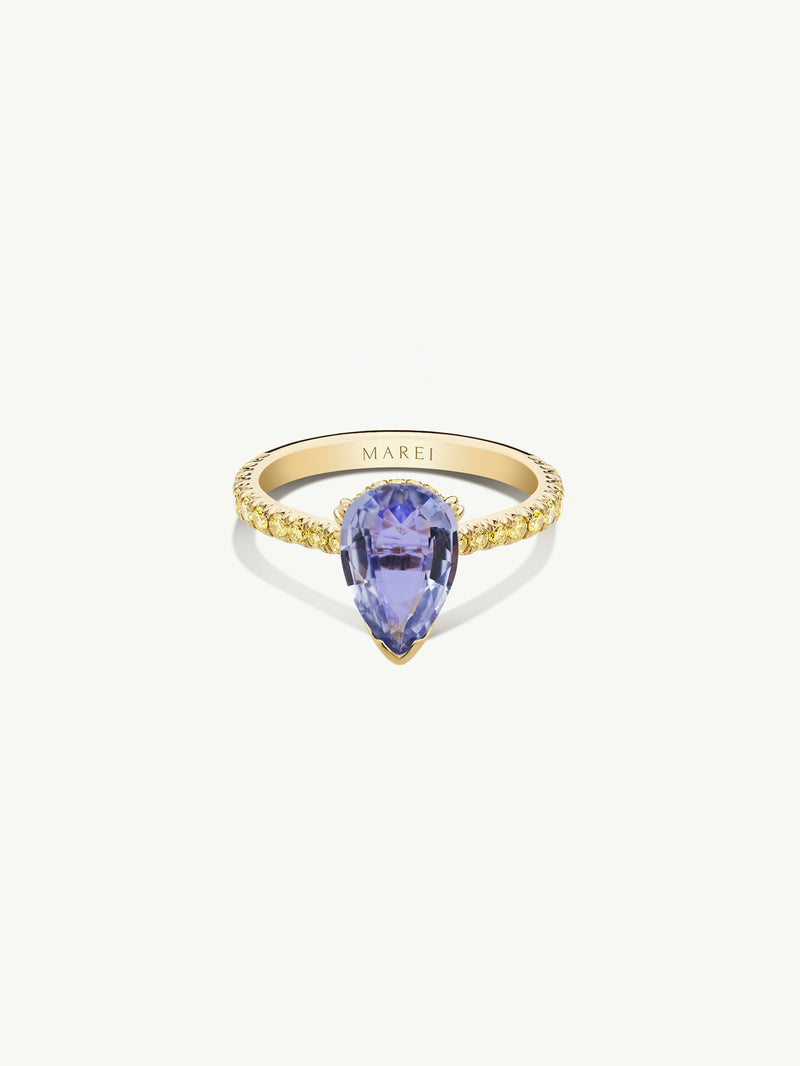 The deco-inspired Phebe Ring by New York jewelry designer Angie Marei combines luxury and elegance into one stunning piece of jewelry. A purple sapphire center stone is cut in a timeless, brilliant pear shape surrounded by a halo of scintillating, radiant, brilliant yellow diamonds. Exquisitely handcrafted in 18-karat yellow gold, this piece is sure to impress.
