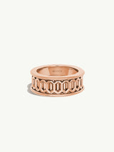 The Amanti Infinity Spinning Ring by Angie Marei is exquisitely handcrafted with great precision in precious 18-karat rose gold. This piece possesses a mesmerizing repeating geometric pattern of three-dimensional open windows, creating a vignette that glitters and shines when spun around.