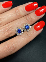 These elegant Celestial Stud Earrings showcase vibrant blue natural sapphires encircled by a sparkling halo of brilliant-cut white diamonds. Skillfully handcrafted in 18-karat white gold, these breathtaking earrings bring timeless sophistication and radiant beauty to any look.