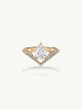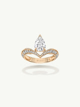 The Dorian Floating Teardrop Engagement Ring by Angie Marei features a brilliant-cut pear-shaped white diamond designed to mirror a water droplet delicately held in suspension. This stunning piece is skillfully handcrafted in 18-karat yellow gold and encrusted with rows of sparkling pavé-set white diamonds. Visualize the soft waves of the ocean as they bind together with the strength of the human spirit.