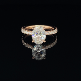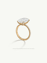 As its name suggests, Suma, the Arabic word for "moonlight" and "beauty," the fiercely feminine Suma Engagement Ring by designer Angie Marei is the ultimate embodiment of striking beauty featuring an exquisite brilliant cut Oval-Shaped white diamond mounted in a classic four-claw-prong 18-karat yellow gold and pavé diamond setting. Glittering white diamond accents are skillfully handset adorning each prong and band. And a single sparkling white diamond is secretly set beneath the center stone touching the wearer's skin. A romantic element of surprise and symbol of love.
