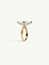 The Marei Diamond Halo Engagement Ring by jewelry designer Angie Marei, showcases a stunning brilliant-cut Marquise Blue Aquamarine jewel enthroned in an Art-Deco-inspired claw setting. Handcrafted from 18-karat yellow gold and pavé-set brilliant-cut round white diamonds, this gorgeous piece will dazzle and delight the senses with its hidden halo of sparkling white diamonds creating a sparkling effect around the centerpiece gemstone.