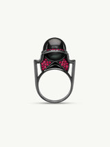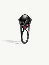 The Isis Goddess Pearl Ring by Angie Marei features a rare, exotic, and luminescent Tahitian Black Pearl enthroned in an 18-karat black gold setting bejeweled in pavé set vibrant pomegranate red rubies and detailed and finished with black enamel.