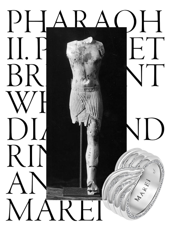 These original pieces are inspired by the draped shendyt kilts worn by ancient Egyptian pharaohs and deities. Marei creates this ring to invoke a feeling of power, seduction, and immortality in the wearer. A daring new spin on traditional Ancient Egyptian jewelry, handcrafted with extraordinary attention to detail.