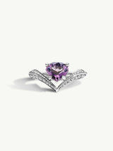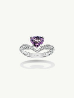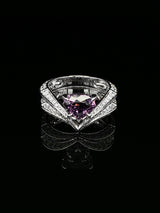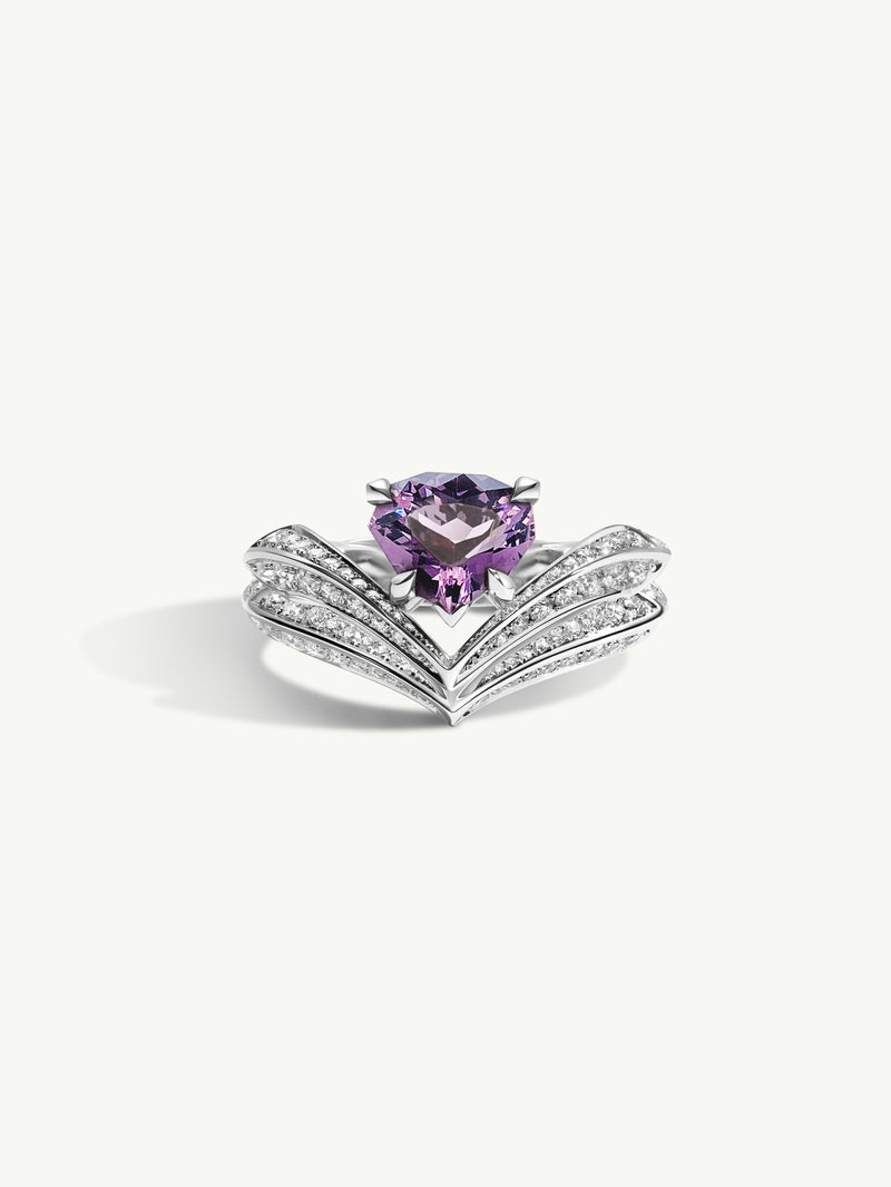 Designed to mirror a water droplet delicately held in suspension, this particular Dorian Floating Engagement Ring by Angie Marei features a one-of-a-kind, rare, purple Spinel gemstone. This Spinel gem was carefully sourced for its beautiful color-changing hues from purple to pink and blue and has been specially cut into this unique brilliant-cut shield shape. The setting is skillfully handcrafted from 18-karat white gold and sparkling brilliant-cut pavé white diamonds. Visualize the soft waves of the ocean as they bind together with the strength of the human spirit.