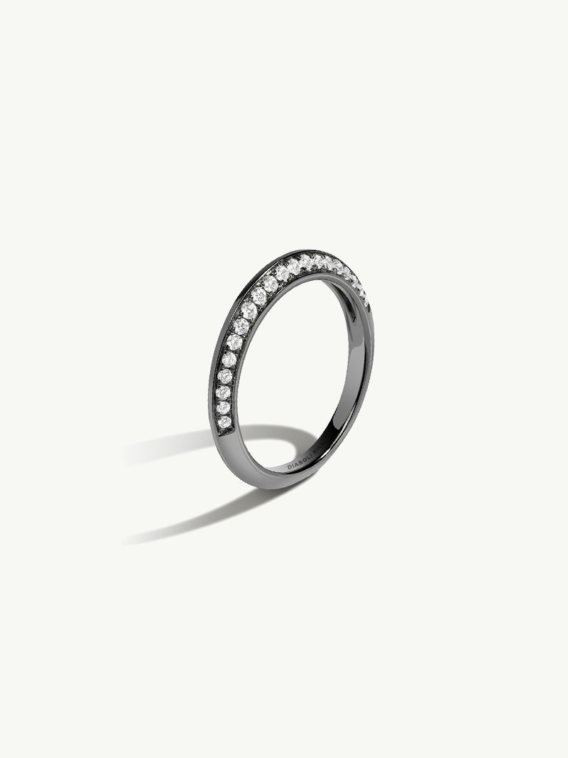 The Marei Beveled-Edge Pavé White Diamond Wedding Ring by Angie Marei features two rows of sparkling brilliant-cut round white diamonds pavé-set on a blackened 18-karat gold band. A beautifully handcrafted piece that gleams and sparkles in the light – and darkness.
