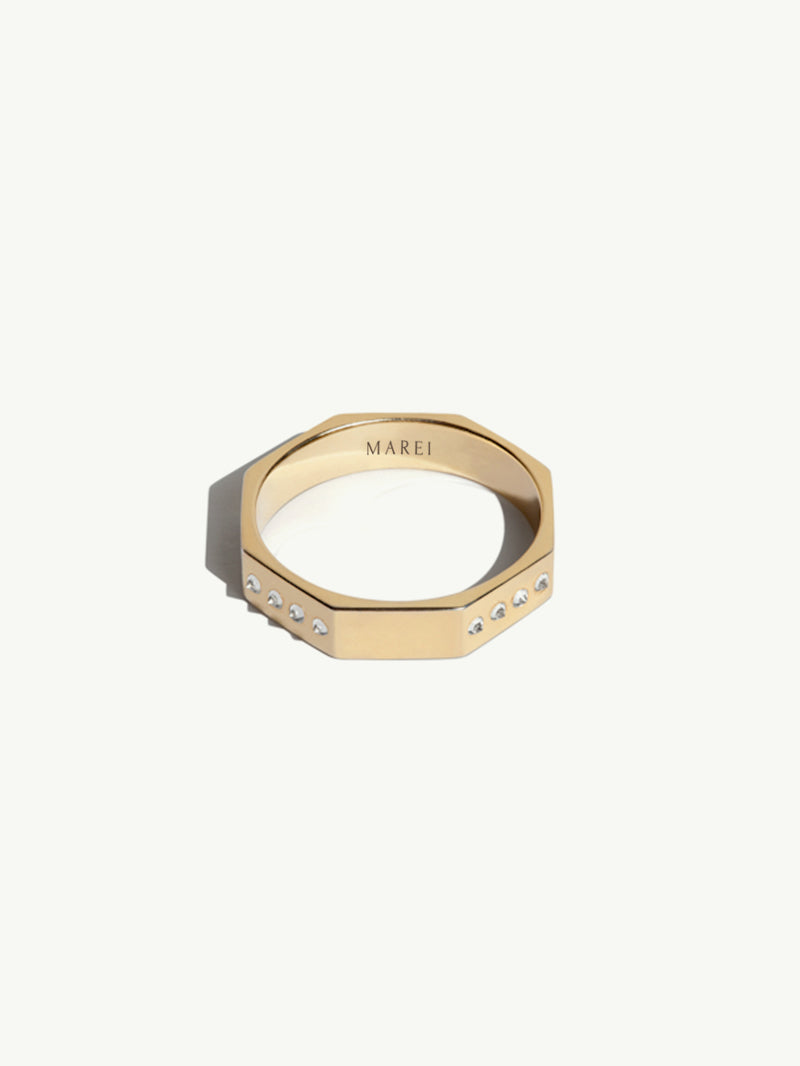 Celebrate your love with the dazzling Octavian Ring, designed by Egyptian-Dominican jeweler Angie Marei. Crafted in luminous 18-karat yellow gold and set with brilliant white diamonds, this piece is a radiant testament to eternal devotion.