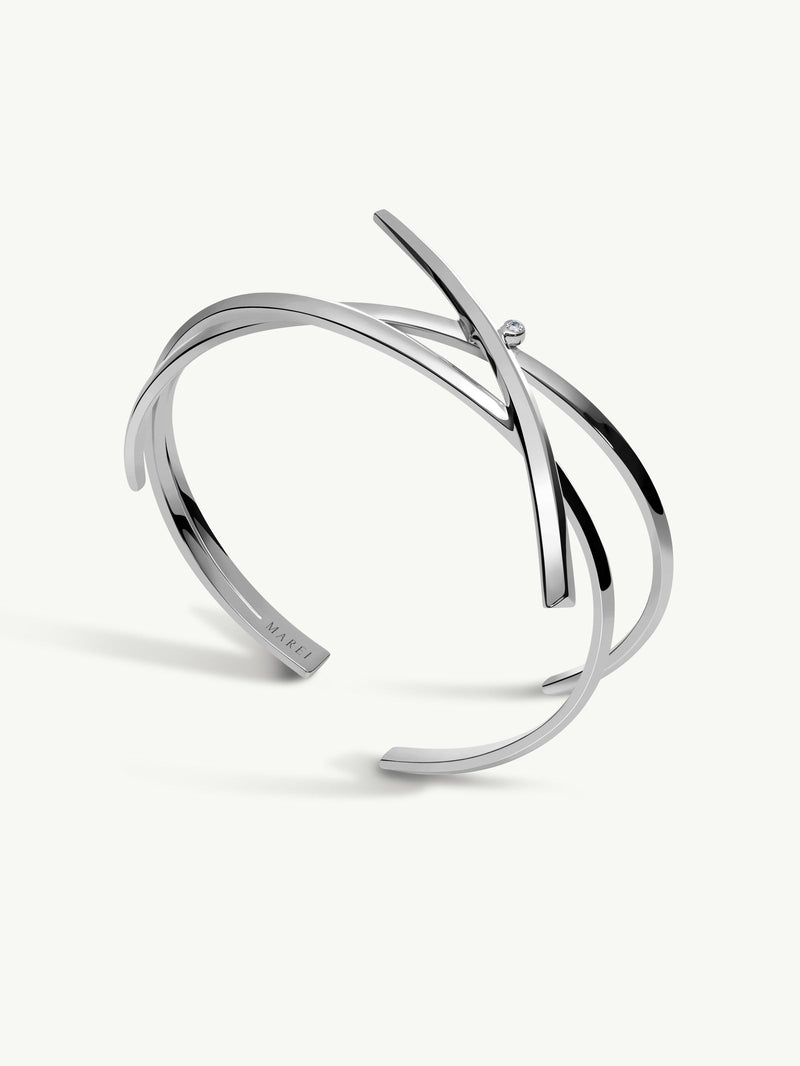 The Pythia Serpentine Twist Diamond Cuff Bracelet by Angie Marei features a luxurious sparkling brilliant-cut round white diamond mounted on a sculptural setting to elegantly adorn the wrists of the modern-day Cleopatra. This Ancient Egyptian-inspired striking bracelet seductively wraps around the wrist, resembling a twisting coiled serpent, an ancient symbol of royalty, divine authority, immortality, and transformation.
