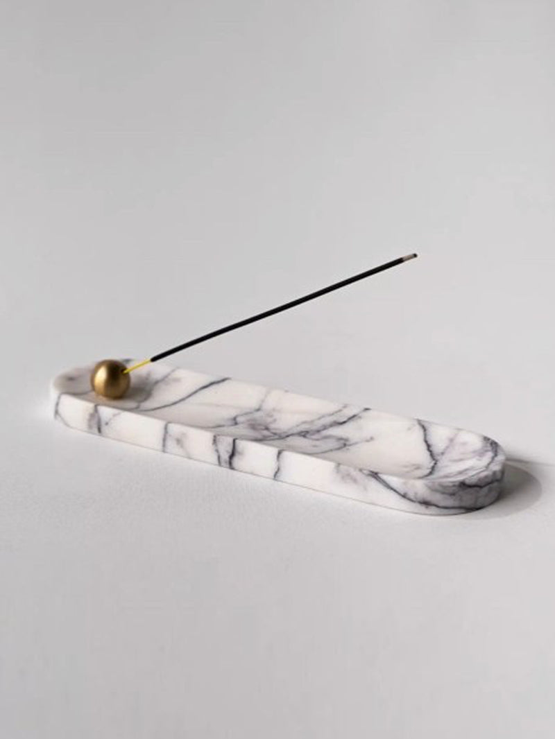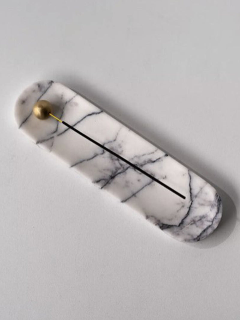 The sculptural elegance of our Tarabiza incense holder brings serenity and peace to your living spaces. Handcrafted in Turkey from serene lilac marble, this exquisite piece features a brass ball incense holder, achieving a perfect balance of elegance and simplicity. The soothing aroma of the incense is released gently, enhancing your environment.