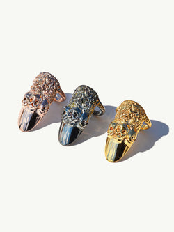 Anything but innocent, these nail shield rings add a touch of fierce glamour to your manicure. Our gold nail rings are designed for a snug fit on the fingertip, gracefully covering the nail bed.