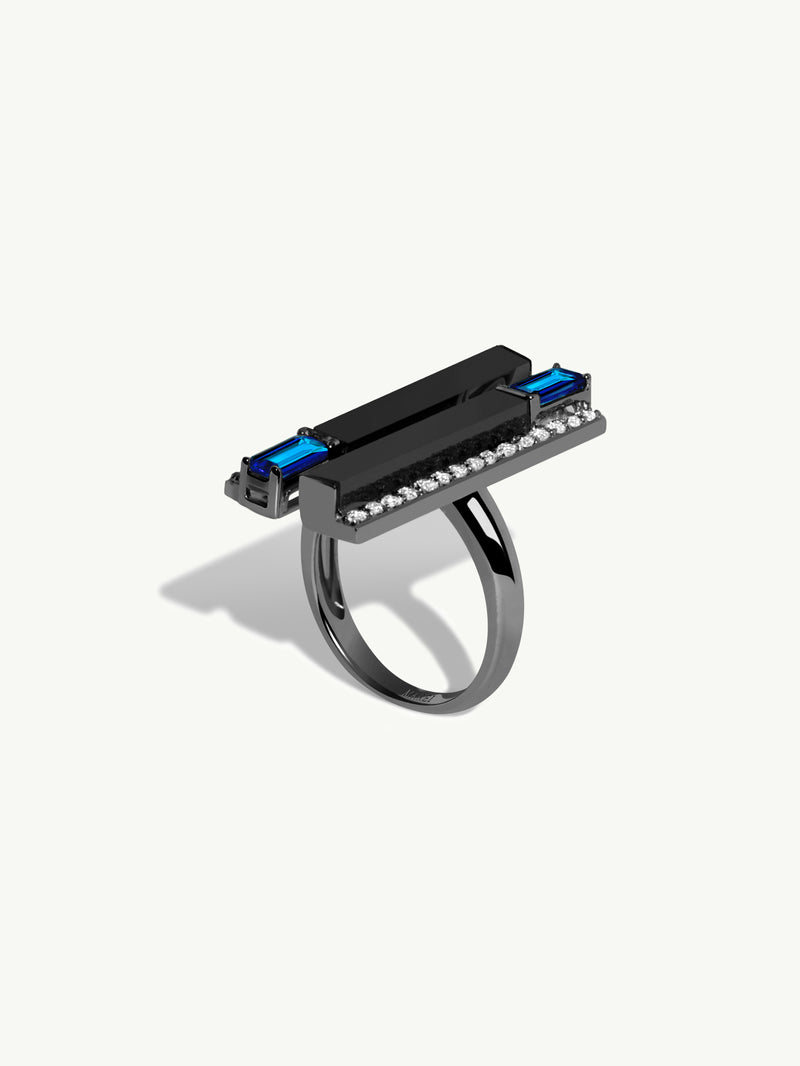 The Invidia Black Onyx and Blue Sapphire Column Ring by Angie Marei is a bold and sculptural statement piece, meticulously handcrafted in luminous 18-karat blackened gold. This captivating design features sleek columns of hand-carved and polished black onyx, accented with vibrant baguette-cut blue sapphires, and framed by brilliant pavé-set and straight baguette-cut white diamonds. Architecturally bodied and exquisitely balanced, the ring embodies the geometric precision and modern glamour of the Art Deco era, fused with the sacred artistry and symbolism of Ancient Egyptian jewelry.