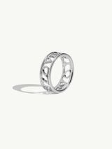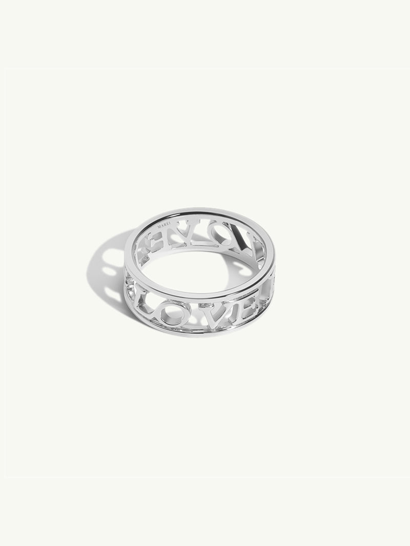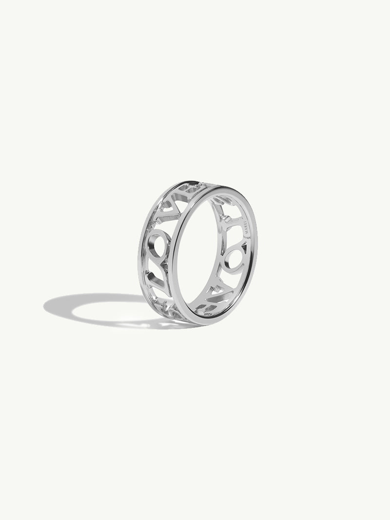 The Love Is Love Ring by Angie Marei is cast and crafted in luxurious 18-karat white gold metal. This beautiful graphic ring is reminiscent of ancient Roman open work rings from the 3rd and 4th centuries and features elegant lettering reading "Love Is Love". Love has no boundaries.